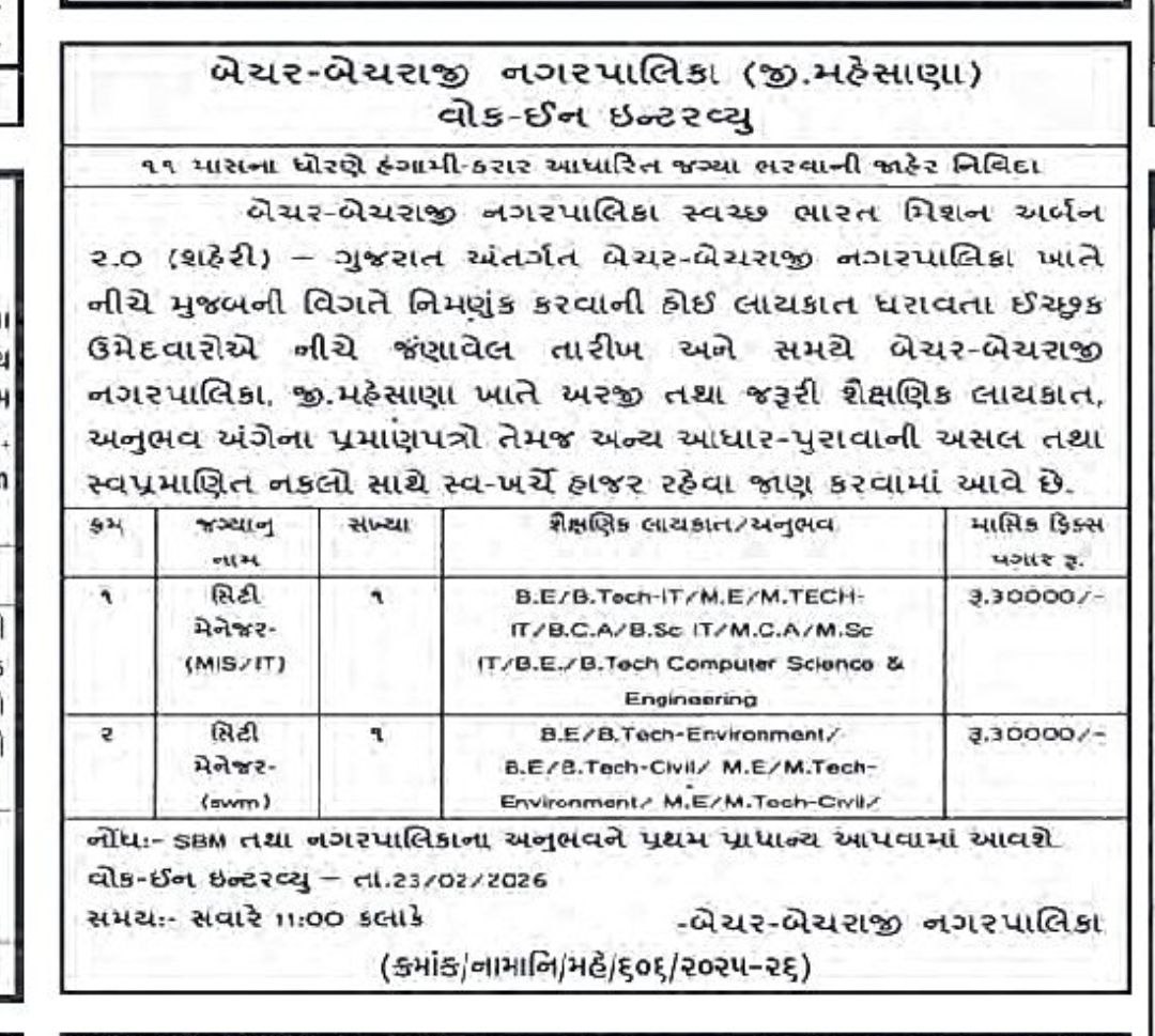 Becharaji Nagarpalika Recruitment 2026: गुजरात में सरकारी और अर्ध-सरकारी नौकरियों की तलाश कर रहे युवाओं के लिए वर्ष 2026 एक सुनहरा अवसर लेकर आया है। मेहसाणा जिले में स्थित बेचाराजी नगरपालिक ने Swachh Bharat Mission Urban 2.0 (SBM-U 2.0) परियोजना के अंतर्गत City Manager (MIS/IT) और City Manager (Solid Waste Management – SWM) पदों पर भर्ती की आधिकारिक घोषणा की है। यह भर्ती पूरी तरह से 11 महीने की अस्थायी संविदा (Contract Basis) पर की जा रही है, जिसमें चयन Walk-in Interview के माध्यम से होगा।