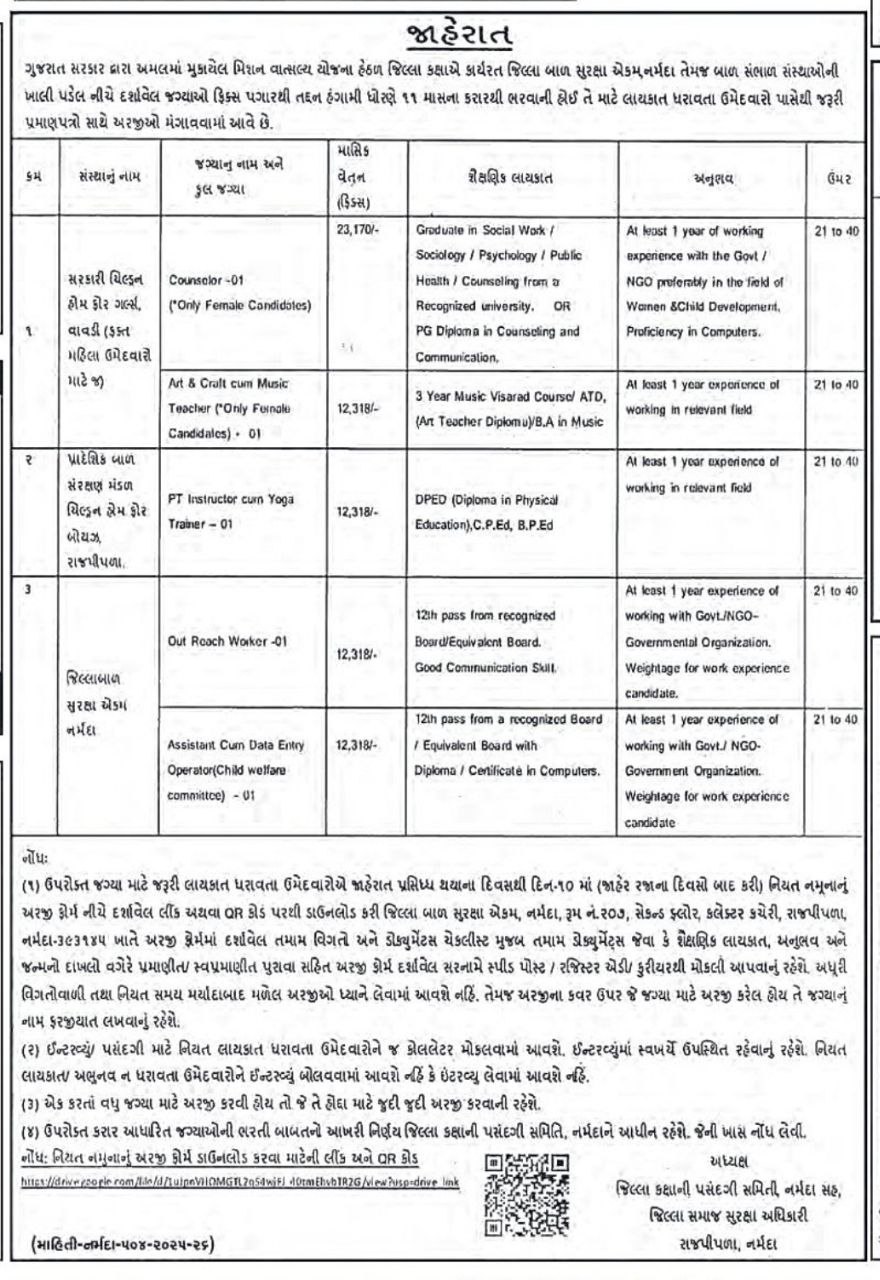 सभी पदों पर नियुक्ति नर्मदा जिला (राजपीपला), गुजरात में की जाएगी और चयनित उम्मीदवारों को जिले के अंतर्गत संचालित संस्थानों एवं परियोजनाओं में कार्य करना होगा।