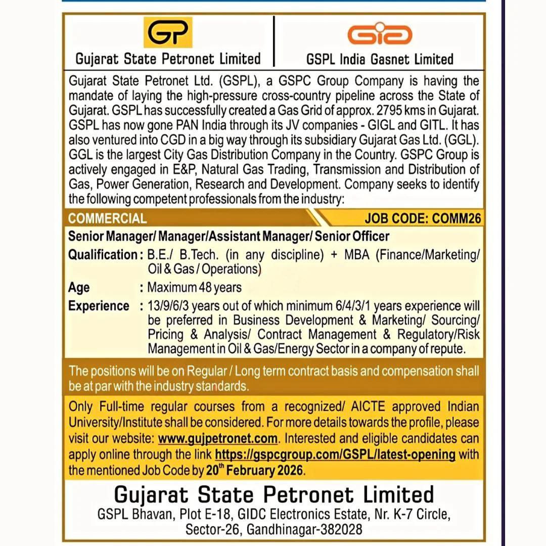 GSPL Recruitment 2026: गुजरात राज्य पेट्रोनेट लिमिटेड (GSPL) ने वर्ष 2026 के लिए एक बड़ी और आकर्षक भर्ती अधिसूचना जारी की है, जो ऊर्जा और ऑयल एंड गैस सेक्टर में करियर बनाने का सपना देख रहे अनुभवी पेशेवरों के लिए एक सुनहरा अवसर है। GSPL, जो कि GSPC ग्रुप की एक प्रमुख कंपनी है, गुजरात में हाई-प्रेशर नेचुरल गैस ट्रांसमिशन नेटवर्क का संचालन करती है और देश के ऊर्जा इंफ्रास्ट्रक्चर में अहम भूमिका निभाती है। कंपनी अब अपने कमर्शियल डिपार्टमेंट को मजबूत करने के उद्देश्य से सीनियर मैनेजर, मैनेजर, असिस्टेंट मैनेजर और सीनियर ऑफिसर जैसे महत्वपूर्ण पदों पर योग्य और अनुभवी उम्मीदवारों की भर्ती कर रही है।