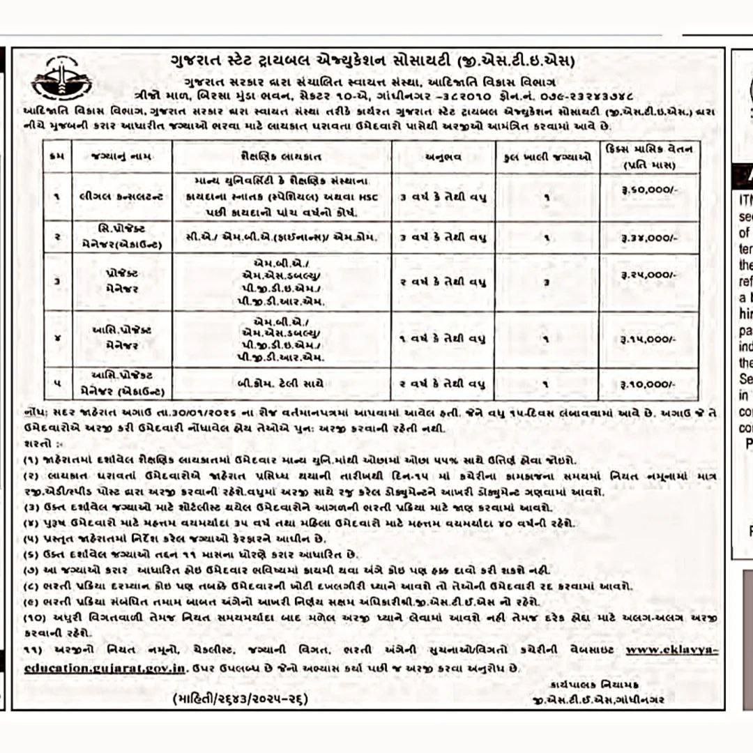 GSTES गांधीनगर भर्ती 2026 उन उम्मीदवारों के लिए एक उत्कृष्ट अवसर है जो गुजरात सरकार के साथ काम करते हुए समाज के आदिवासी वर्ग के लिए कुछ सार्थक करना चाहते हैं। संविदा आधारित होने के बावजूद यह भर्ती प्रोफेशनल अनुभव, स्थिर वेतन और सरकारी कार्यप्रणाली को समझने का बेहतरीन मंच प्रदान करती है। यदि आप योग्यता और अनुभव की सभी शर्तों को पूरा करते हैं, तो यह भर्ती आपके करियर के लिए एक मजबूत कदम साबित हो सकती है। समय सीमा का विशेष ध्यान रखते हुए आवेदन प्रक्रिया पूरी करना अत्यंत आवश्यक है।