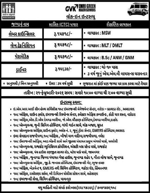 GVK EMRI Green Health Services Recruitment 2026: GVK EMRI Green Health Services भारत की उन चुनिंदा संस्थाओं में से एक है, जो आपातकालीन स्वास्थ्य सेवाओं के क्षेत्र में वर्षों से उत्कृष्ट कार्य कर रही है। “108 एम्बुलेंस सेवा” के माध्यम से यह संस्था लाखों लोगों की जान बचाने में अहम भूमिका निभा चुकी है। वर्ष 2026 में GVK EMRI ने गुजरात राज्य में बड़े पैमाने पर Walk-in Interview Recruitment Drive की घोषणा की है, जो स्वास्थ्य और आपातकालीन सेवाओं में करियर बनाने का सपना देख रहे उम्मीदवारों के लिए एक बेहतरीन अवसर है।