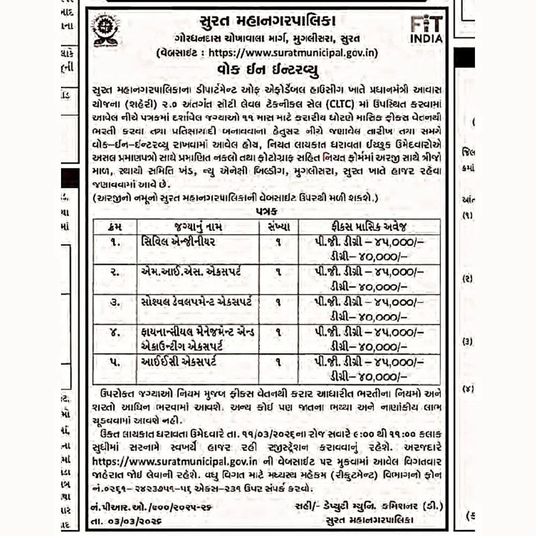 SMC Vacancy 2026: अगर आप शहरी विकास परियोजनाओं में काम करना चाहते हैं और तकनीकी या सामाजिक क्षेत्र में अपनी विशेषज्ञता का उपयोग करना चाहते हैं, तो सूरत नगर निगम (Surat Municipal Corporation – SMC) ने एक शानदार अवसर प्रदान किया है। हाल ही में निगम ने प्रधानमंत्री आवास योजना (शहरी) 2.0 – PMAY-U 2.0 के अंतर्गत विभिन्न विशेषज्ञ पदों के लिए भर्ती की घोषणा की है। यह भर्ती सिटी लेवल टेक्निकल सेल (CLTC) के लिए की जा रही है, जिसका उद्देश्य शहर में किफायती आवास परियोजनाओं को बेहतर तरीके से लागू करना और उनकी निगरानी करना है।