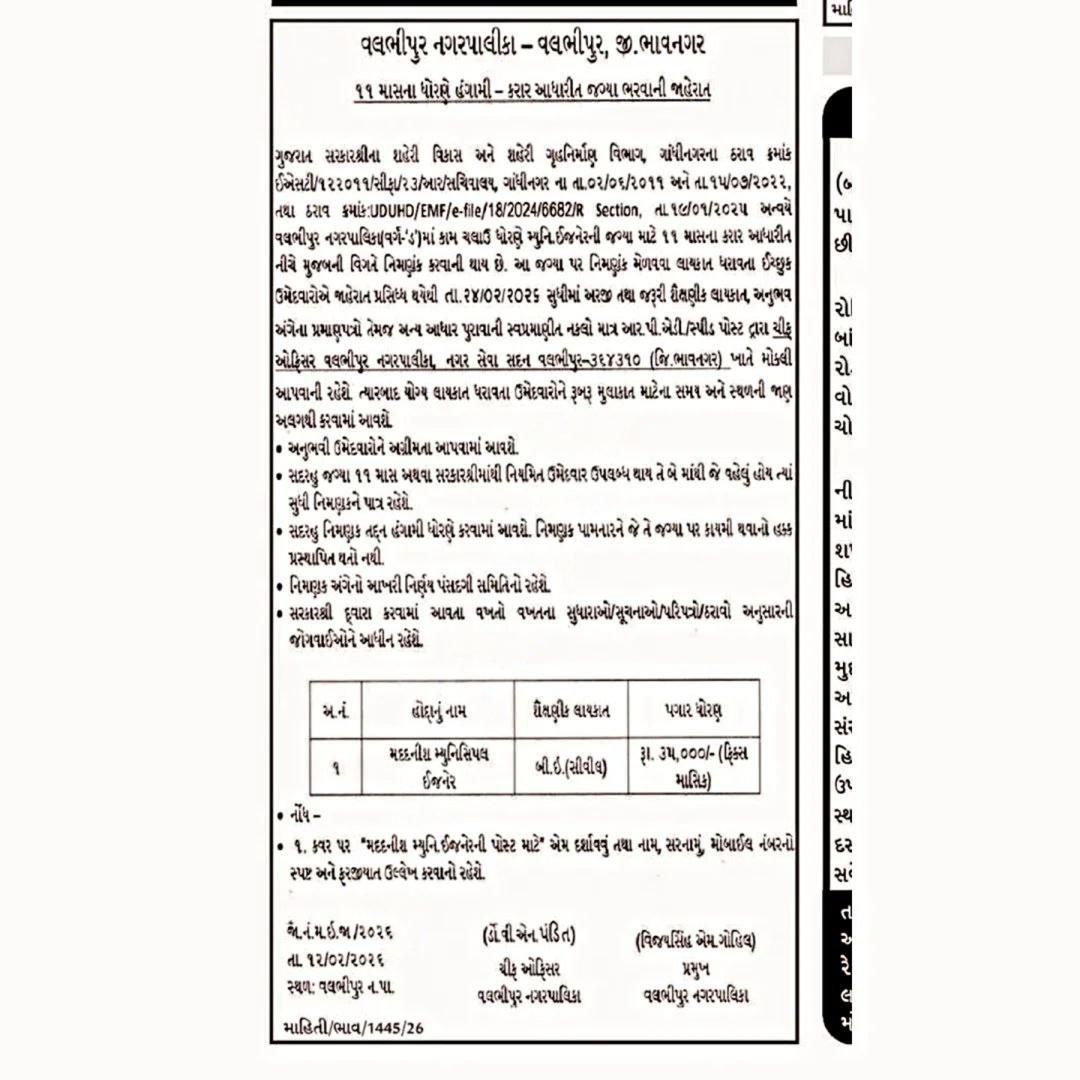 Vallabhipur Nagarpalika Recruitment 2026: गुजरात राज्य में सरकारी या अर्ध-सरकारी नौकरी की तलाश कर रहे सिविल इंजीनियरिंग उम्मीदवारों के लिए वर्ष 2026 एक महत्वपूर्ण अवसर लेकर आया है। भावनगर जिले में स्थित वल्लभीपुर नगरपालिकाने Assistant Municipal Engineer (Civil) पद के लिए भर्ती अधिसूचना जारी की है। यह भर्ती शहरी विकास एवं शहरी आवास विभाग, गुजरात सरकार के दिशा-निर्देशों के अंतर्गत की जा रही है। इस नियुक्ति की सबसे खास बात यह है कि यह स्थानीय प्रशासन से जुड़कर काम करने का अवसर प्रदान करती है, जहाँ उम्मीदवारों को शहरी विकास परियोजनाओं में प्रत्यक्ष रूप से योगदान देने का मौका मिलेगा।
