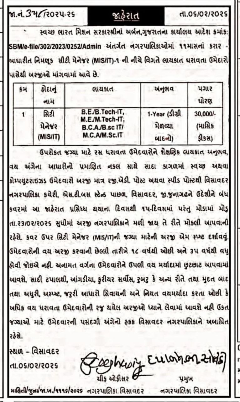 Visavadar Nagarpalika Recruitment 2026: विसावदर नगरपालिका में सिटी मैनेजर (MIS/IT) पद पर भर्ती! आवेदन शुरू